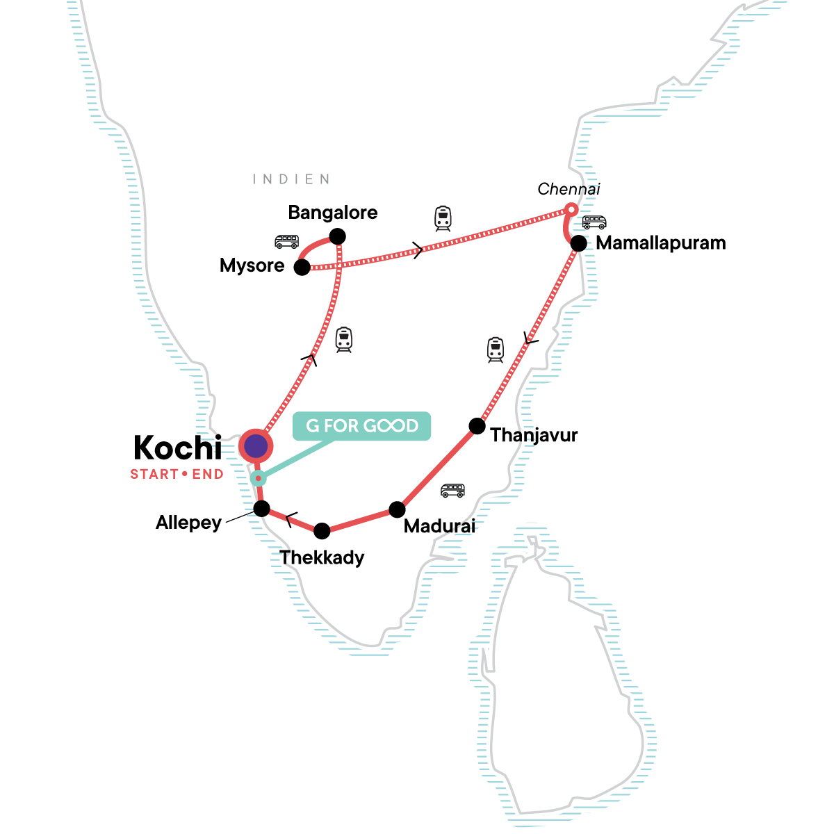 Dein Local-Living-Moment: Gastfamilie in den Kerala Backwaters, Alleppey. Orientierungs-Spaziergang in Fort Kochi. Kathakali-Tanz-Show. Besichtigung Chaumundi-Tempel und Mysore-Palast. Besichtigung des Mamallapuram-Küstentempels. Orientierungs-Spaziergang in Pondicherry. Fahrradrikscha-Fahrt durch Madurai und Besichtigung des Sri-Meenakshi-Tempels. Tour durch eine Gewürzplantage in den Cardamom Hills. Alle Transfers zwischen den Reisezielen sowie zu inbegriffenen Aktivitäten und zurück