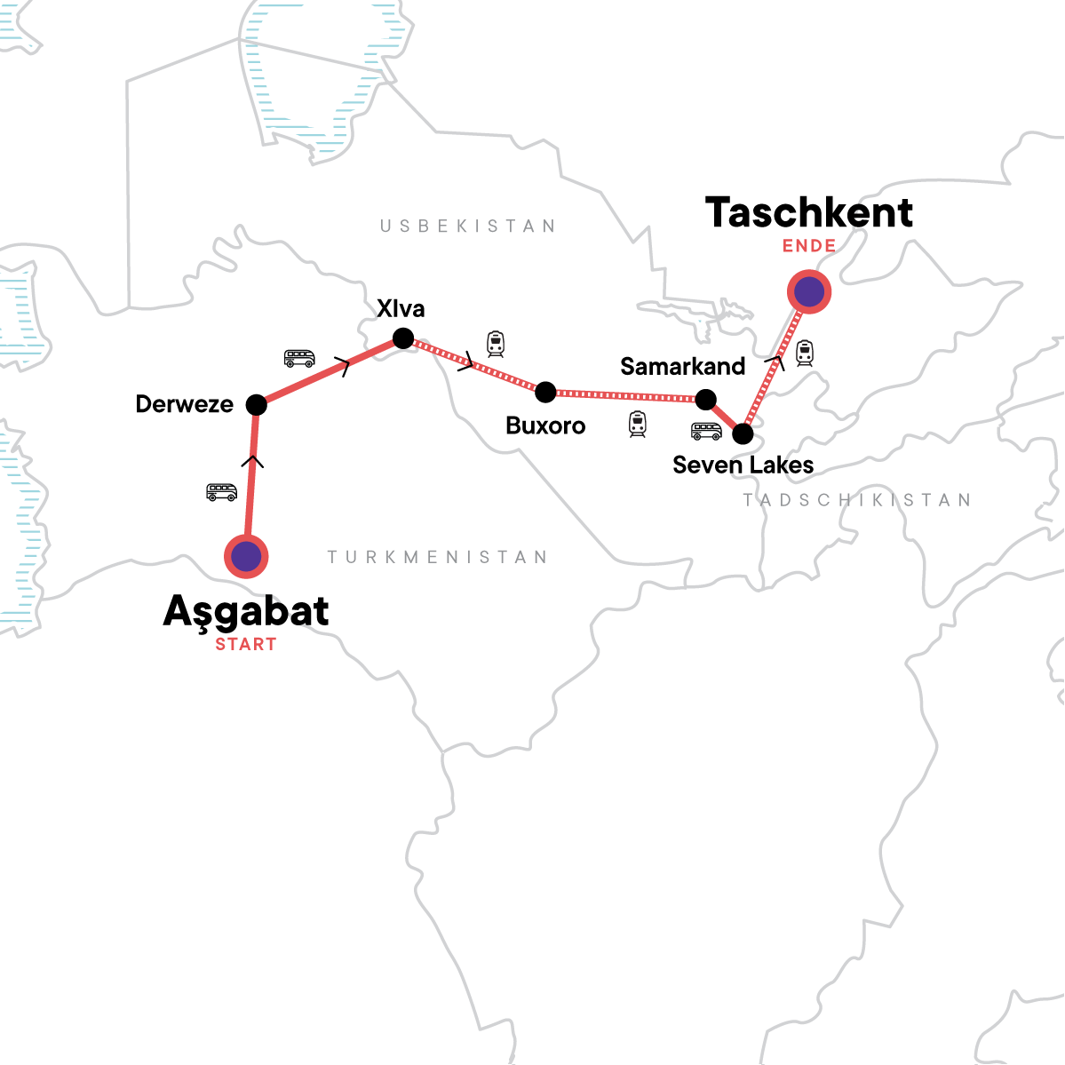 Dein Welcome-Moment: Welcome Moment - Meet Your CEO and Group, Ashgabat. Arrival transfer. Guided tour of Ashgabat. Visit to National Museum. Visit Old Nisa. Guided tour of Khiva. Free time in Khiva. Train to Bukhara. Guided tour of Bukhara. Free time in Bukhara. Explore Siyab bazaar. Visit of Panjakent Market. Visit to the Seven Lakes area. Train to Samarkand. Guided tour of Samarkand. Free time in Samarkand. Train to Tashkent. Free time in Tashkent. Guided tour of Tashkent. All transport between destinations and to/from included activities